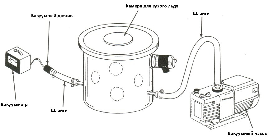 Во время сушки необходимо регулярно проверять центральную камеру на предмет наличия твёрдых фрагментов сухого льда. Если сухой лёд полностью растворится в окружающей жидкости – температура коллектора начнёт расти и условия лиофилизации будут нарушены.